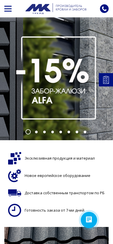 SEO-описание | Компания МКтрейд — один из лидеров на рынке производства металлочерепицы, металлоштакетника, профнастила, заборов-жалюзи. Изготовление всего от 2-х дней Рассрочка 0%. Доставка по всей Беларуси. |