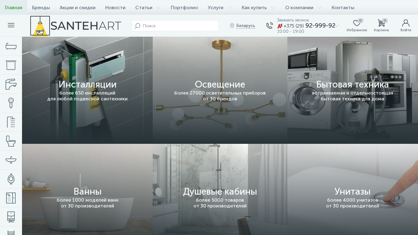SEO-описаниеБольшой выбор сантехники и мебели для ванной комнаты, освещения, бытовой техники в интернет-магазине santehart.by. Ванны, душевые кабины, унитазы, раковины и аксессуары по выгодным ценам с доставкой по Минску и Беларуси.