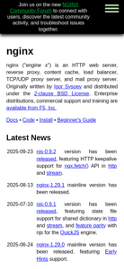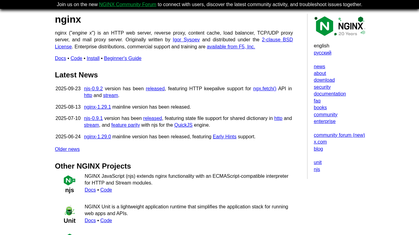 | AI-анализ | The website nginx.org is the official home of the NGINX open-source web server project. The site primarily focuses on providing documentation, code downloads, news, and community resources related to NGINX. NGINX is an HTTP web server, reverse proxy, content cache, load balancer, TCP/UDP proxy server, and mail proxy server. The project was originally written by Igor Sysoev and is distributed under the 2-clause BSD License. Enterprise distributions, commercial support, and training are available from F5, Inc. The site features a community forum, blog, news section, and downloads for various versions of NGINX, including releases and older versions. Additionally, there are sections for NGINX JavaScript (njs) and NGINX Unit, which extend NGINX functionality and simplify application stacks, respectively. Other projects related to NGINX, such as |