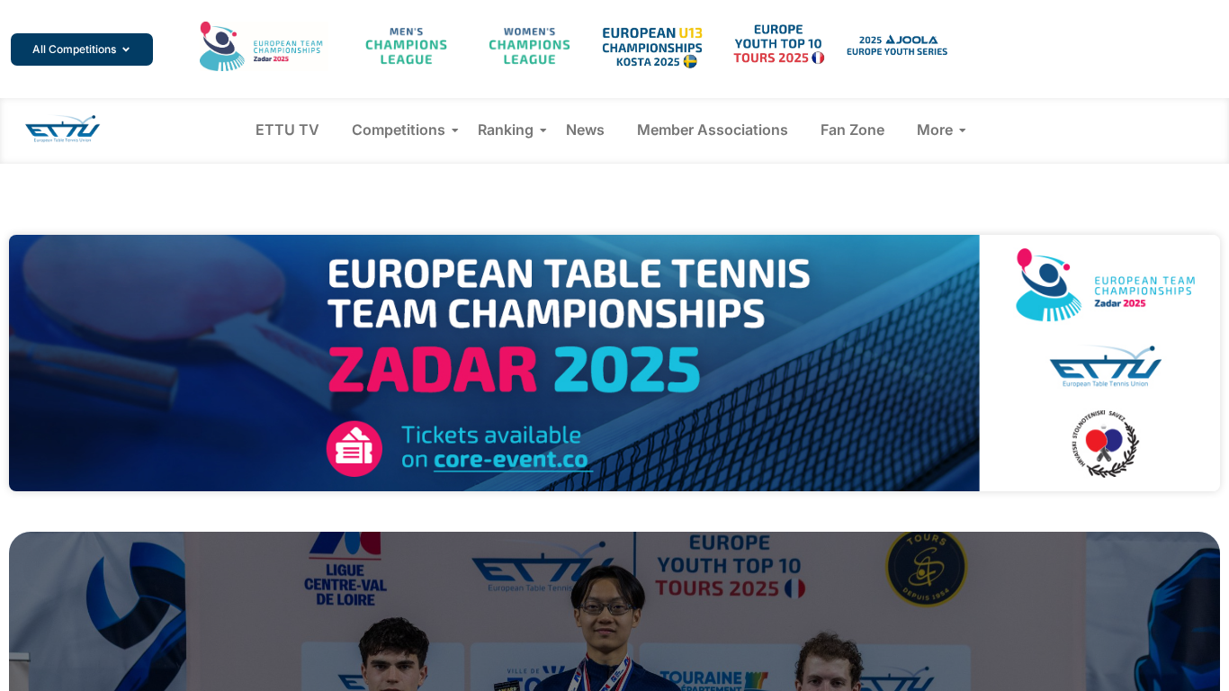SEO-описание | Zadar Ready for the European Team ChampionshipsClick HereNathan LAM Crowned Under 19 Boys Champion in ToursEurope Top 10Click HereFrancesco TREVISAN Wins Under 15 Boys’ Title in ToursEurope Top 10 Click HereNina GUO ZHENG Leads French Triumph in Tours – Under 19 Girls’ Title Decided on Head-to-HeadEurope Top 10Click HereITAGAKI Dominates to Win Under 15 Girls |