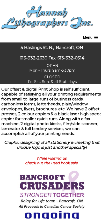 Название / Заголовок | Hannah Lithographers Inc. - Bancroft, Ontario |