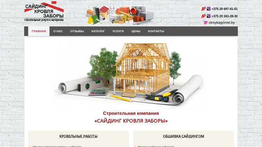 SEO-описание | Частная строительная компания «САЙДИНГ КРОВЛЯ ЗАБОРЫ» оказывает профессиональные услуги строительства и ремонта по Гомелю и Гомельской области, а также предлагает своим клиентам большой выбор строительных товаров. Строительство всегда сопровождается повышенным спросом на стройматериалы и услуги и мы готовы сделать все, чтоб Ваш ремонт закончился в строго установленные сроки и Вы получили именно тот результат, который Вам нужен. Ваша стройка – наша забота! Гомель, ИП Лапшин Е.Н. УНП 490788779 «САЙДИНГ КРОВЛЯ ЗАБОРЫ». |