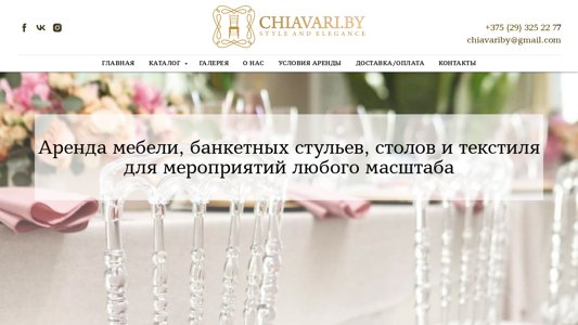 SEO-описание | Chiavari.by является надежной компанией по предоставлению в аренду мебели, банкетных столов и стульев, текстиля и посуды для мероприятий различного формата. |