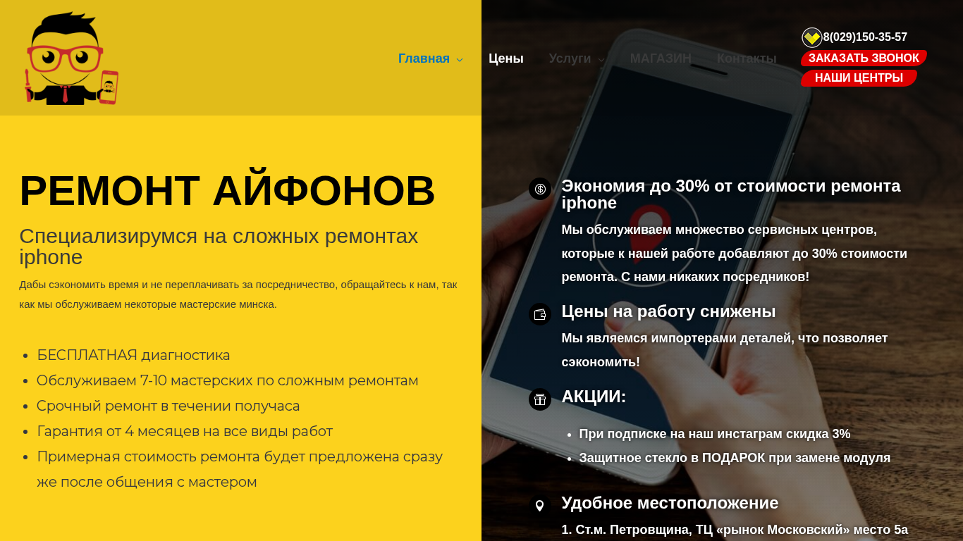 SEO-описание | Ремонт айфонов в Минске по доступным ценам. Цены на ремонт iphone снижены! ✅ Бесплатная доставка в ремонт и обратно. ☎ +375 (29) 168-68-11 Звоните! |