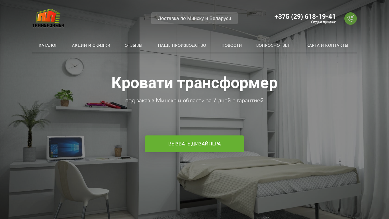 | SEO-описание | Купить кровать трансформер в Минске✅ Шкаф-кровать трансформер по индивидуальному проекту. ✅ Заказать кровать встроенную в шкаф в рассрочку ✅ Стоимость по телефону ☎ +375 (29) 618-19-40 |