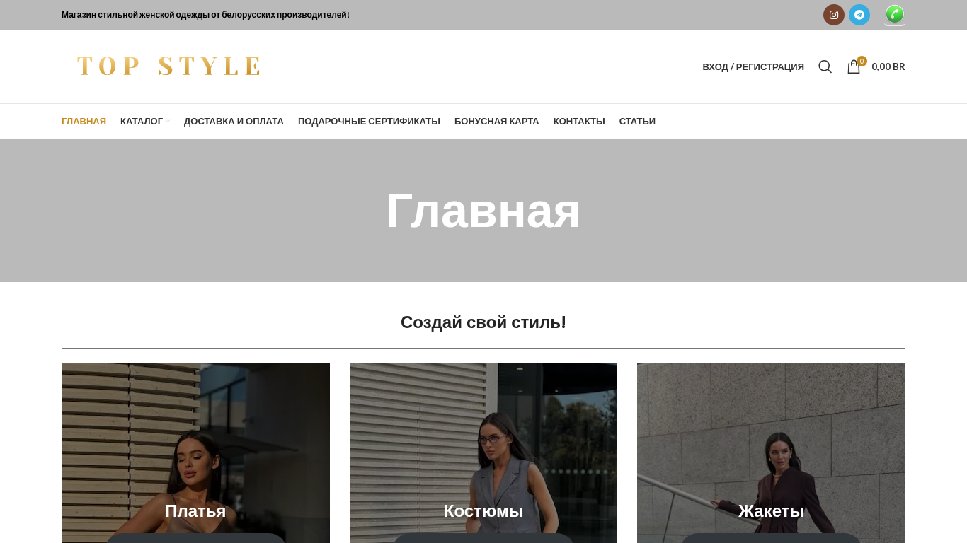 SEO-описание | Интернет-магазин стильной женской одежды от белорусских производителей Топ Стайл! Здесь вы найдёте всё: костюмы, платья, юбки, брюки, жакеты, блузы, топы. |