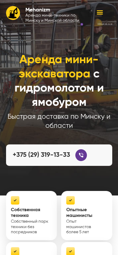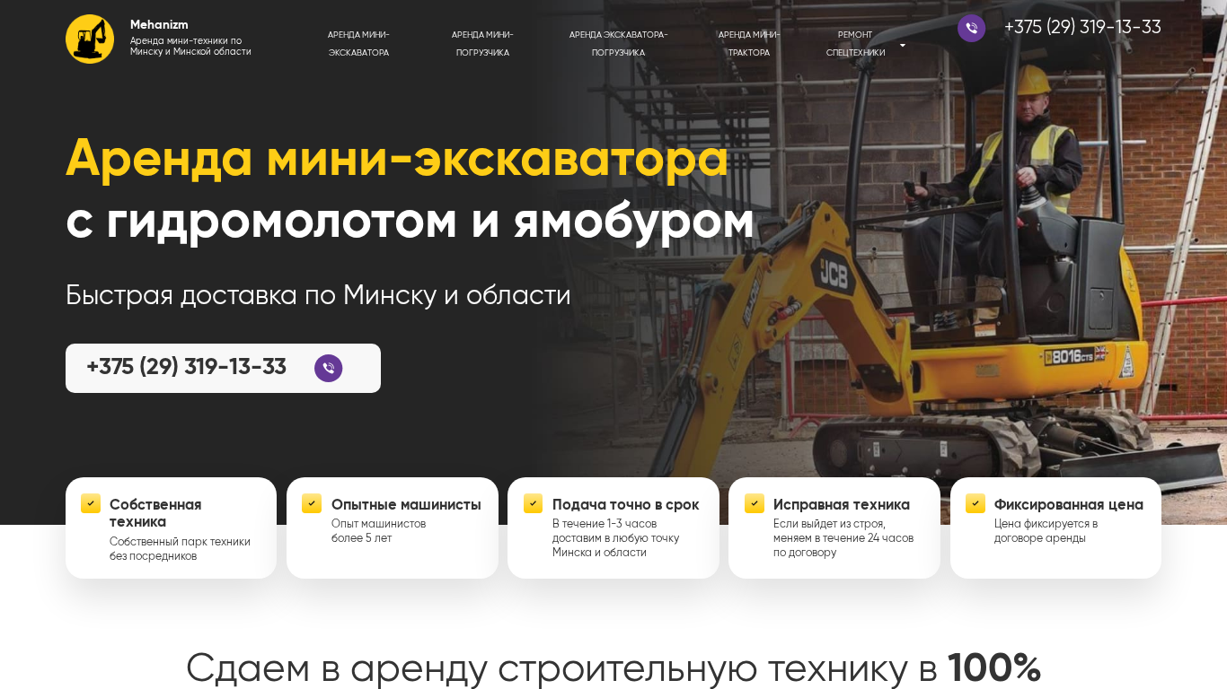 SEO-описание🚜 Аренда мини экскаватора в Минске и области по низкой цене! Быстрая подача, гибкие условия. 🔧 Идеально для стройки и земляных работ. 📞 +375 (29) 319-13-33 🌐 mehanizm.by — звоните или заказывайте онлайн! ✅