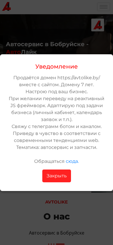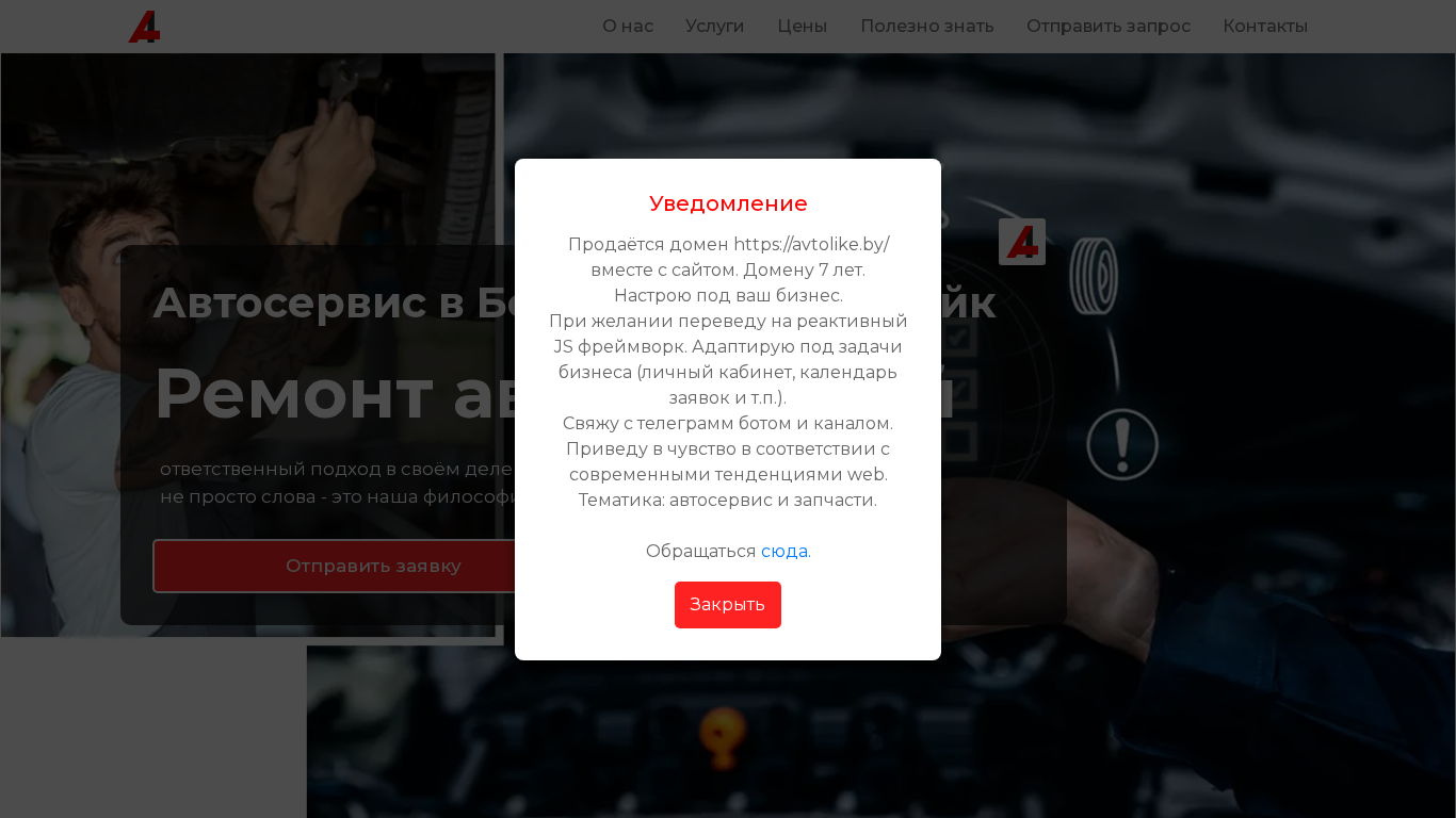 SEO-описание | Автосервис в Бобруйске – AvtoLike. Ремонт и обслуживание автомобилей - полный комплекс услуг. Профессионализм, гарантия качества, прозрачное ценообразование. |