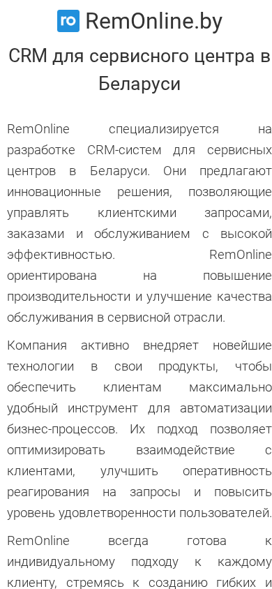 SEO-описание | RemOnline специализируется на разработке CRM-систем для сервисных центров в Беларуси. |