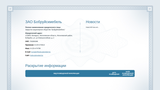 SEO-лексика | пароль бобруйскмебель зао e-mail информации адрес размещенной зарегистрироваться полное наименование юридического лица закрытое акционерное общество юридический 213805 беларусь могилевская область |