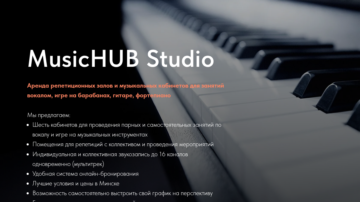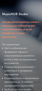 | AI-анализ | The portal MusHUB Studio offers rental of rehearsal rooms and musical cabins for vocal practice and playing musical instruments such as piano, drums, guitar, and others. Six cabins are available for individual and group rehearsals, featuring equipment including pianos, microphones, active columns, and desks for notes. Cabin 1 is designed for vocal teaching and individual rehearsals, equipped with an acoustic piano, microphone stand, active column with Bluetooth connection, piano bench, and mirror. Cabin 3 is dedicated to drum lessons and individual practice, providing drums, Sonor Forcе 3007 drum set, active column with Bluetooth connection, piano bench, and drum stool. Cabin 4 offers space for guitar lessons, vocal practice, and individual rehearsals, featuring a synthesizer, microphone, piano bench with a music stand, electric and classical guitars, |