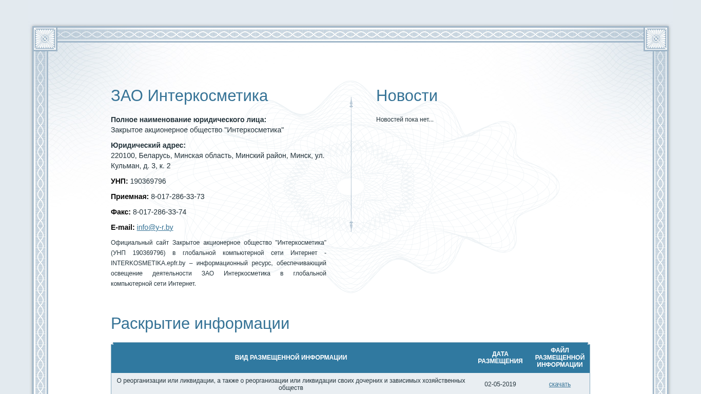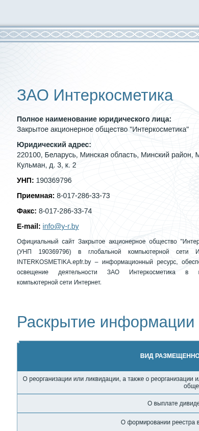 | AI-анализ | The web project "INTERKOSMETIKA.EPFR.BY" is an informational resource for Закрытое акционерное общество "Интеркосметика" (Closed Joint Stock Company "Intercosmetica"). The website provides information on the company's activities in the global computer network Internet. Available documents include announcements on the reorganization or liquidation of the company and its subsidiaries, as well as the formation of shareholder registries and the payment of dividends. The website was developed by epfr.by. |