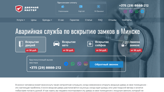 SEO-описание | Служба вскрытия замков круглосуточно приходит на помощь жителям Минска и области. ✅Качественно, аккуратно и быстро открываем входные двери ✅Цены фиксированные! Вскрываем замки квартир, сейфов и авто быстро без повреждений. Вам не придется долго ждать, звоните! |