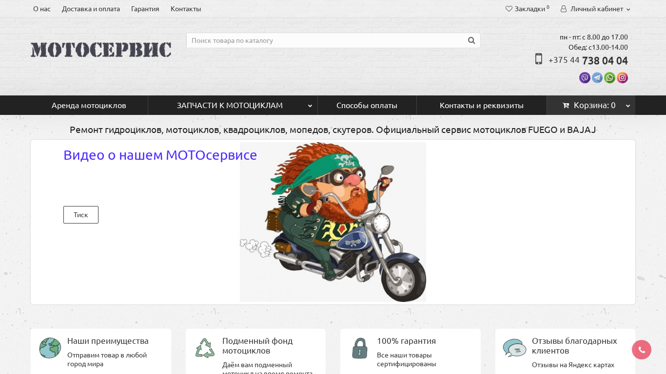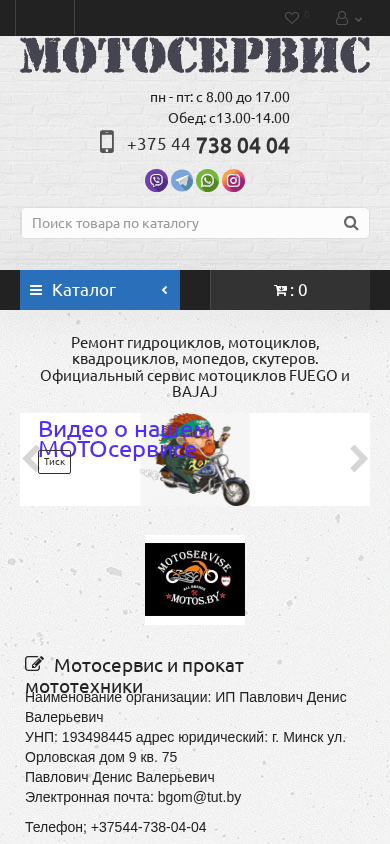 | AI-анализ | The portal Motoservis is an official service provider for FUEGO and BAJAJ motorcycles, offering repair, replacement, and rental services for various motor vehicles including motorcycles, quadricycles, mopeds, scooters, and hydrocycles. The website features a personal cabinet for user registration, authorization, and access to an empty shopping cart. The business is located in Minsk and can be reached via phone at +375 44 738 04 04. The portal supports various methods of payment and offers a deposit fund for motorcycle rentals during repair. Customers can leave reviews on the portal and on Yandex maps. The website is certified and has a five-star rating. It is also available on Instagram and Yandex maps for easy location. The business offers a guarantee on all its products and services, and guarantees a replacement |