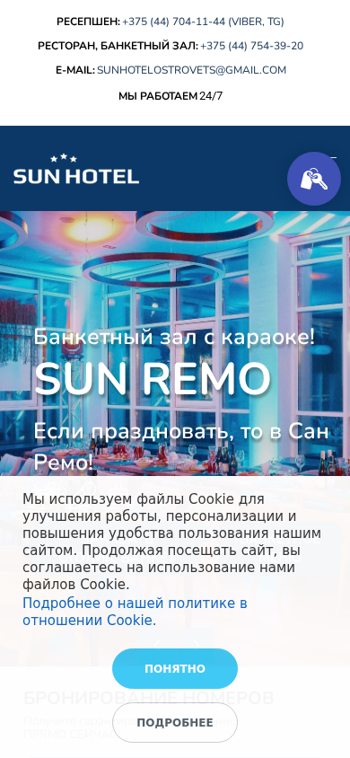 SEO-описание | Отель Sun Hotel - современный городской отель, построен в 2016 году и находится в центре Островца по адресу ул. К. Маркса, 14, насчитывает 62 номера различной категории. В отеле есть ресторан европейской кухни, бар, тренажерный зал 24/7, бильярд. Контакты: +375 (44) 704-11-44, +375 (1591) 7-85-66. |
