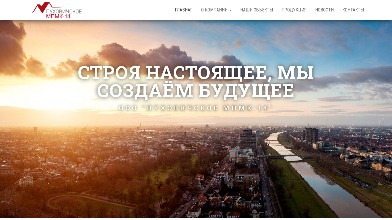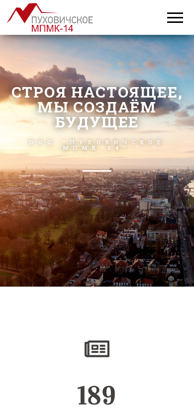 SEO-описаниеСтроя настоящее, мы создаём будущее ООО "Пуховичское МПМК-14" НАМ 6 ЛЕТ! Успех приходит только к настоящим фанатам своего дела. К тем, у кого рабочий день не начинается в 9 и не заканчивается в 18.00. К тем, кто не относится к работе формально, а живет... Читать далее 189 построенных объектов 50 постоянных клиентов 20 Полученных наград
