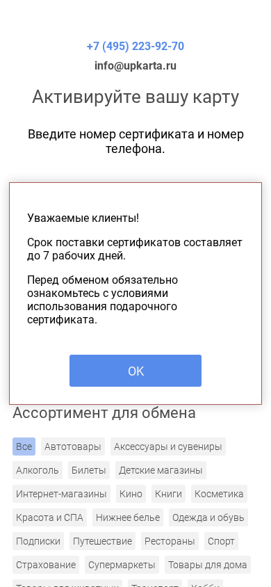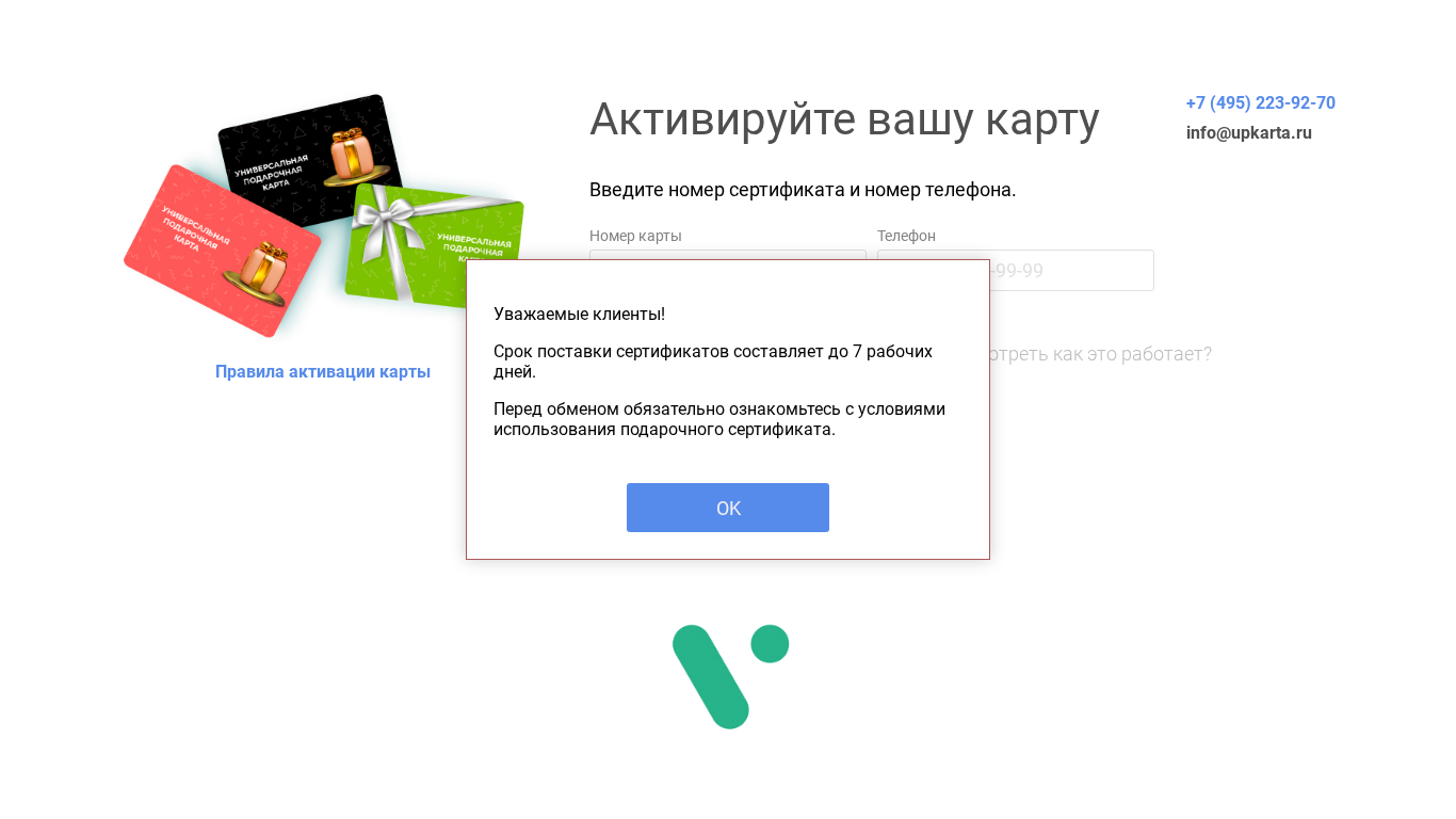 Название / Заголовок | Upkarta - Активация универсальной подарочной карты | Обмен сертификатов |