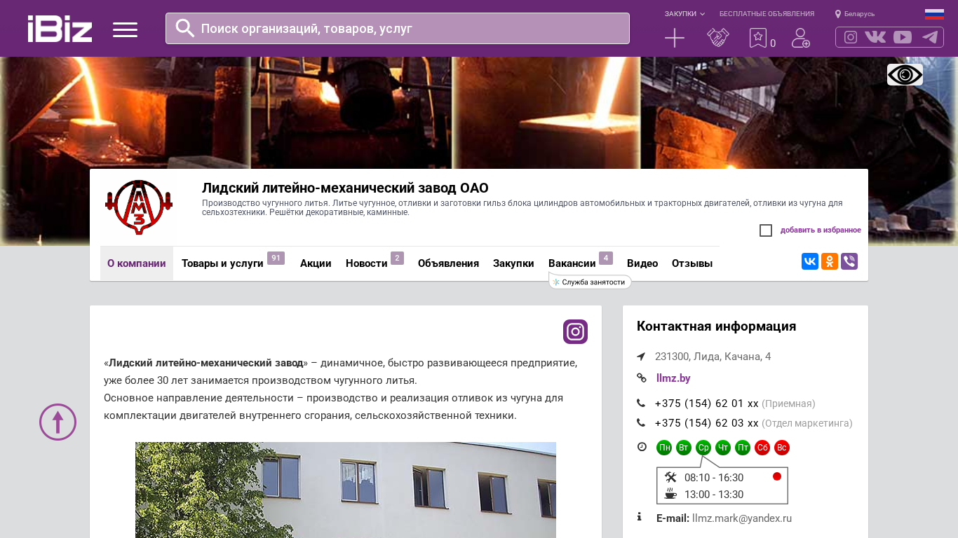 SEO-описание | Лидский литейно-механический завод ОАО - Производство чугунного литья. Литье чугунное, отливки и заготовки гильз блока цилиндров автомобильных и тракторных двигателей, отливки из чугуна для сельхозтехники. Решётки декоративные, каминные.. Схема проезда, контактные телефоны, адрес компании Лидский литейно-механический завод ОАО. 231300, Лида, , Качана, 4 |