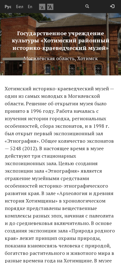SEO-описание | Государственное учреждение культуры «Хотимский районный историко-краеведческий музей» — новости и афиша мероприятий, информация для посетителей, цены, экспозиция, коллекции, материалы для музейщиков. |