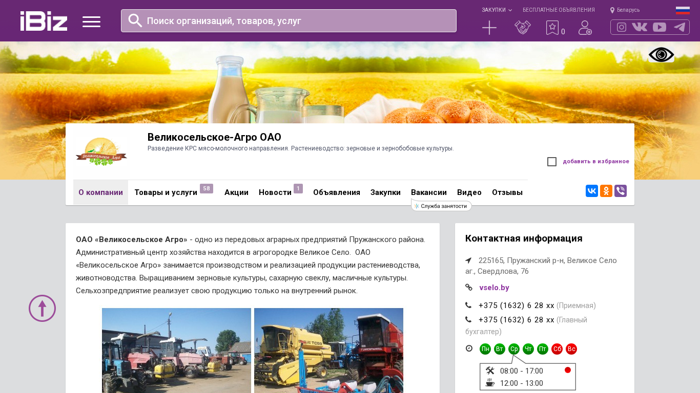 Название / Заголовок | Великосельское-Агро ОАО - Разведение КРС мясо-молочного направления. Растениеводство: зерновые и зернобобовые культуры.. 225165, , Великое Село аг., Свердлова, 76 |