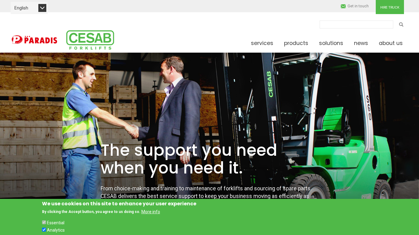 | AI-анализ | The website is for Cesab Material Handling Europe, a company providing material handling solutions with various trucks and services. Keywords include 'trucks' and 'material handling'. The homepage features options to hire trucks, search products, and get in touch. Services offered include hand pallet trucks, powered pallet trucks, powered stacker trucks, reach trucks, 3-wheel electric trucks, 4-wheel electric trucks, low level order pickers, engine trucks, and towing solutions. The website offers solutions for both indoor and outdoor use and various power sources. Clients can search for products based on their environment, intensity of use, and power source. The website also includes a section for news and information about the company. Testimonials from satisfied customers are featured, praising the quality of Cesab products and the support provided. The company's address and contact information are provided at the bottom of the page. |