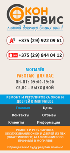 SEO-описание | Профессиональный ремонт и регулировка окон, дверей из ПВХ и алюминия в Могилеве. 15 лет опыта, замена фурнитуры, устранение провисания. Звоните +375 (29) 844-04-12 для быстрого обслуживания! Цены от 20 руб. |