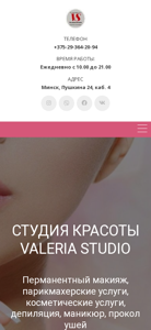 | SEO-описание | Студия красоты Valeria Studio Перманентный макияж Парикмахерские услуги Косметические услуги Депиляция Маникюр Прокол ушей |