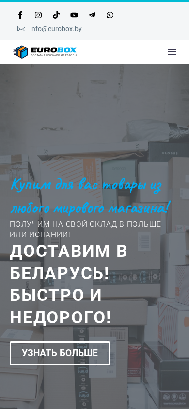 Название / Заголовок | eurobox.by – доставка посылок из магазинов по всему миру в Беларусь – Сервис доставки посылок из Европы. Доставка посылок, форвардинг посылок, доставка покупок из магазинов Европы. |