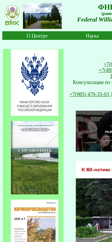 SEO-описаниеОфициальный сайт Федерального государственного бюджетного научного учреждения «Всероссийский научно-исследовательский институт кормов им. В.Р. Вильямса» (ФНЦ «ВИК им. В.Р. Вильямса») ранее «Всероссийский научно-исследовательский институт кормов имени В.Р. Вильямса» (ВНИИ кормов им. В.Р. Вильямса)