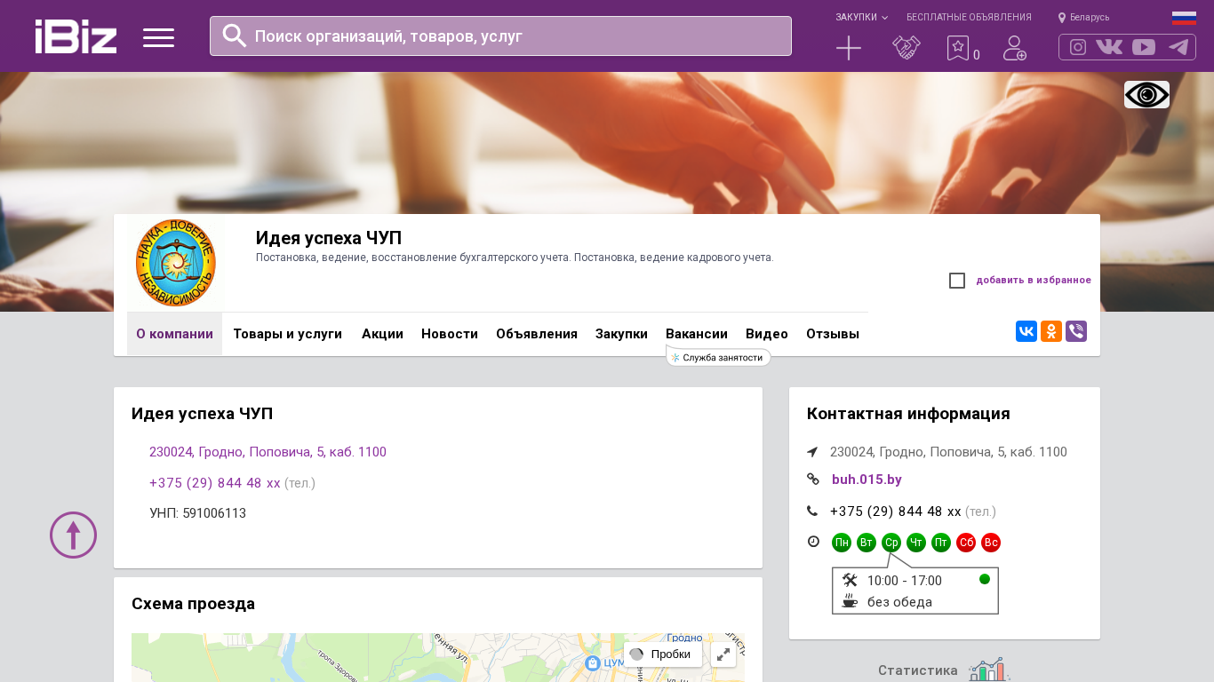 Название / ЗаголовокИдея успеха ЧУП - Постановка, ведение, восстановление бухгалтерского учета. Постановка, ведение кадрового учета.. 230024, Гродно, , Поповича, 5, каб. 1100