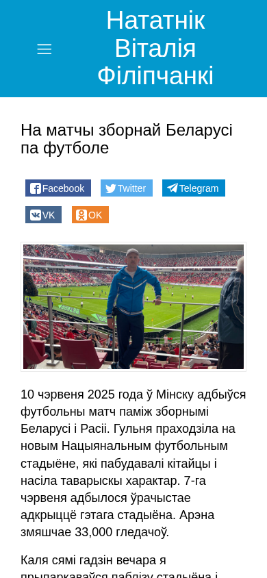 | AI-анализ | The website 'filip.by' is a blog written by Vital Filpchanka. The website contains sections for Sport, Music, Photogallery, Video gallery, Site Map, and Contacts. The blog features posts about Belarusian football matches, local events, and personal experiences. The website was created in 2025 and the author uses social media platforms such as Facebook, Twitter, Telegram, VK, and OK for sharing and interacting with readers. The blog received 133 Facebook, Twitter, Telegram, VK, and OK shares for the post about a Belarusian football match against Russia in Minsk. Another post about a local event in the village of Kisciani received 132 shares. A post about a screening of the film "Time to Return" received 210 shares. The blog does not have a comment section. |