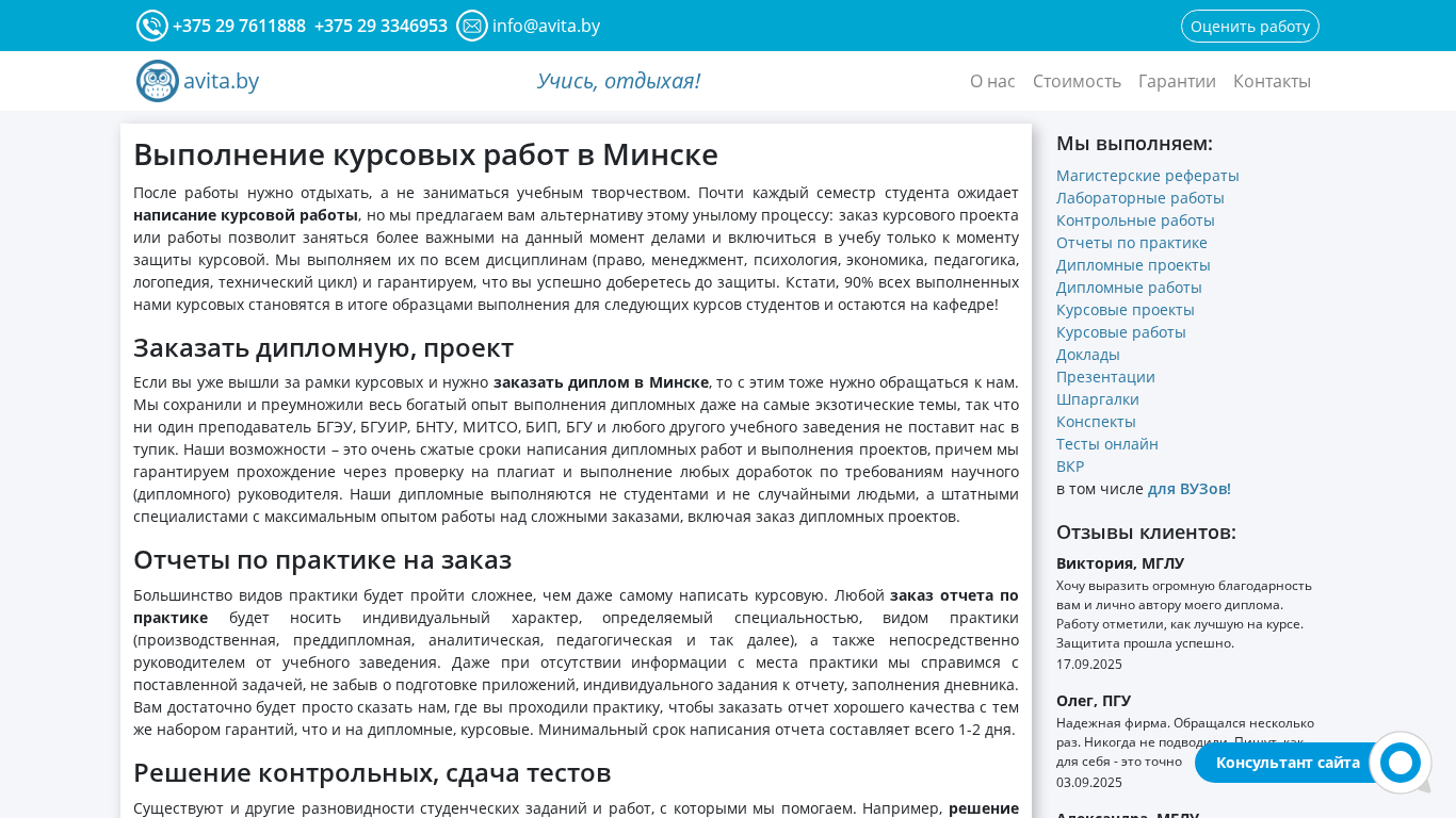 | SEO-описание | Коллектив компетентных авторов окажется помощь учащимся в любом высшем или среднем специальном учебеном заведении Минска. Качественные работы на заказ, в том числе и для технических специальностей. Проверка на плагиат, гарантии, все вовремя. |