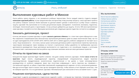 | AI-анализ | The website is a service offering assistance to students in Minsk's universities and colleges in completing their coursework, including diplomas and reports on practical experience. The team of competent authors aims to help students in various fields of study. They provide high-quality works, including for technical specialties, with plagiarism checks and guarantees. Keywords associated with the site include 'courseworks', 'diplomas', 'projects', 'completion', 'Minsk', 'order', 'reports', 'practice', 'solutions', 'control assignments', 'tests', and 'testing'. The site also offers contact information, including phone numbers and an email address, for inquiries and work evaluations. The service offers the completion of courseworks to allow students to focus on more important matters and re-engage with their studies prior to defense. The site claims that 90% of their completed course |