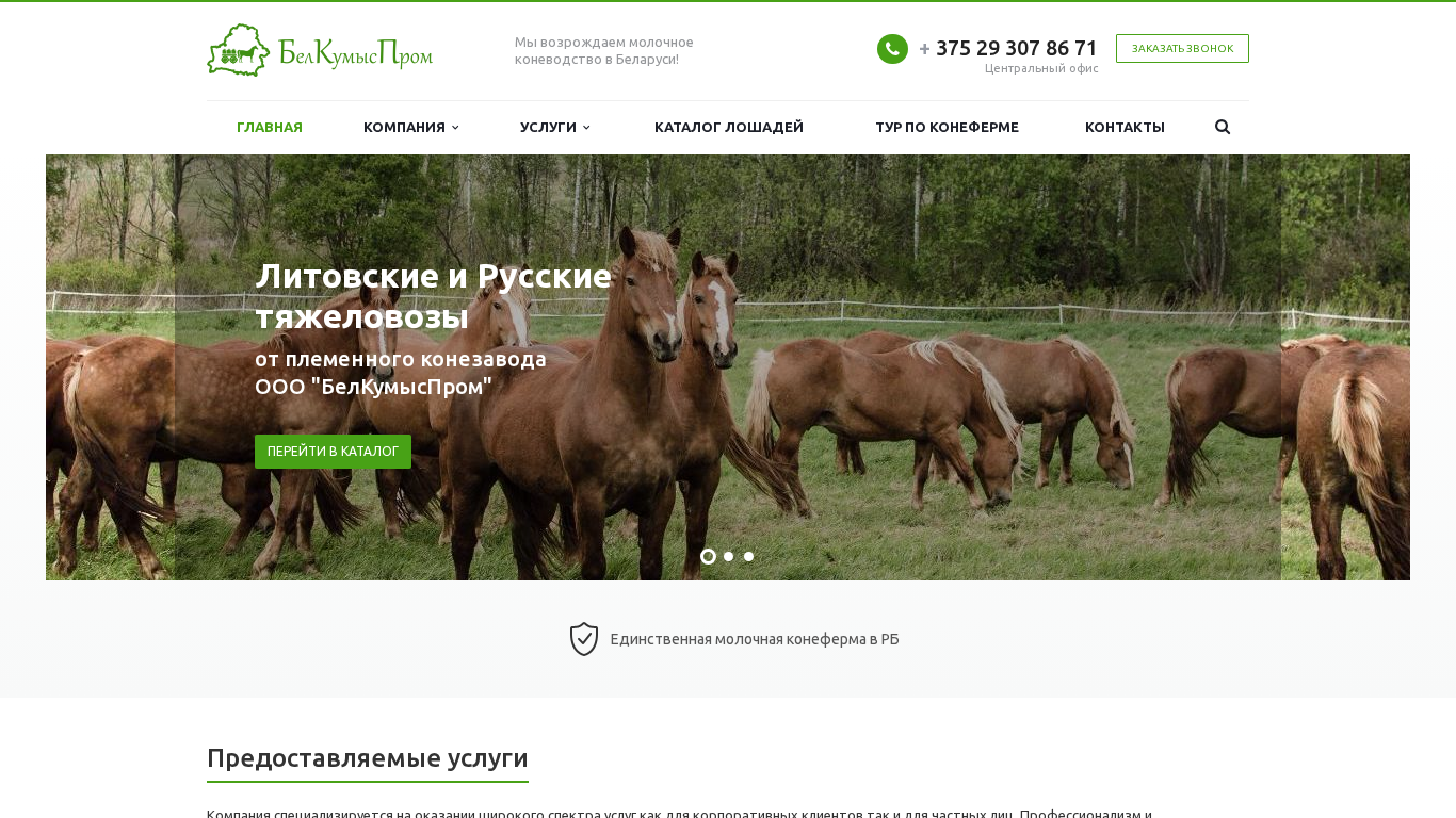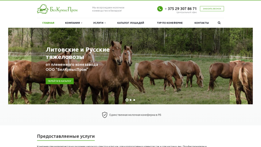 | AI-анализ | --- The portal BelKumysProm.by is a company that offers a wide range of services for both corporate and individual clients. Professionalism and responsibility are the key advantages of our company. The company specializes in the breeding of horses for the production of dairy products from mare's milk using modern technologies. Always available for sale are horses of Russian and Lithuanian heavy draft breeds in various age groups. The company also produces and sells organic horse manure as fertilizer. A tour of the horse farm is proposed for an educational and entertaining day on the premises. A photo session with beautiful horses and nature is also available. Consultation on services is provided by company managers who will answer questions and prepare individual commercial offers. The company BelKumysProm was founded in 2013 and its activities include horse breeding for the production of dairy products from mare's milk. Using the latest |