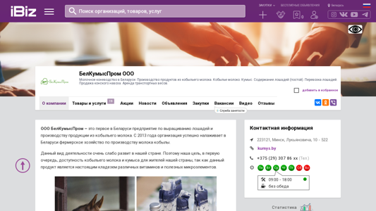 Название / Заголовок | БелКумысПром ООО - Молочное коневодство в Беларуси. Производство продуктов из кобыльего молока. Кобылье молоко. Кумыс. Содержание лошадей (постой). Перевозка лошадей. Продажа конского навоза. Аренда транспортных весов.. 223121, Минск, , Лукьяновича, 10 - 522 |