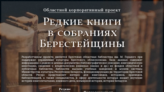 | AI-анализ | The web project "Rare Books in the Collections of Brest Region" is an corporate initiative of Brest Oblast Regional Library named after M. Gorky, with the support of the Department of Culture of Brest Regional Executive Committee. The database contains information about rare and valuable documents (bibliographic description, book annotation, information about ownership bookmarks and others) from the funds of the regional and public libraries, libraries of higher educational institutions and museums of the Ministry of Culture of the Republic of Belarus, operating in the territory of Brest Oblast. The resource is of interest to bibliophiles, historians, local historians, librarians, and specialists in the field of studying the history of printing, book trade, world history, and the history of Belarus. The site represents the rare books collections of the depositories. Domain: books.brl.by |