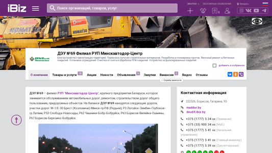 Название / Заголовок | ДЭУ №69 Филиал РУП Минскавтодор-Центр - Благоустройство прилегающих территорий. Перевозка сыпучих строительных материалов. Разработка и планировка грунтов. Ямочный ремонт а/бетонных покрытий. Установка ограждений. Очистка от снега и обработка ПГМ покрытий. Устройство асфальтированных покрытий.. 222526, Борисов, , Гагарина, 95 |