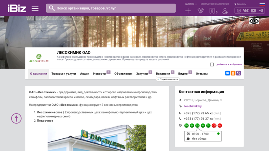 | AI-анализ | The portal Lesohimik OAO is a wood processing and chemical industry company specializing in the production of turpentine, turpentine oil, resins, solvents, and protective agents for wood and plants. Located in Borisov, Belarus, at the address Демина, 3, the company offers a wide range of products for consumer and industrial use, including automotive chemicals, distilled water, antirust fluids, and lacquer and paint products. The production process includes the operation of two main facilities: the wood processing plant, with two production halls for turpentine-terpene and neopolymer resins, and the subsurface facility. The company's product line includes turpentine oil, pine tar, antiseptics, and various solvents. Lesohimik OAO is currently working on a new investment project to expand the production |