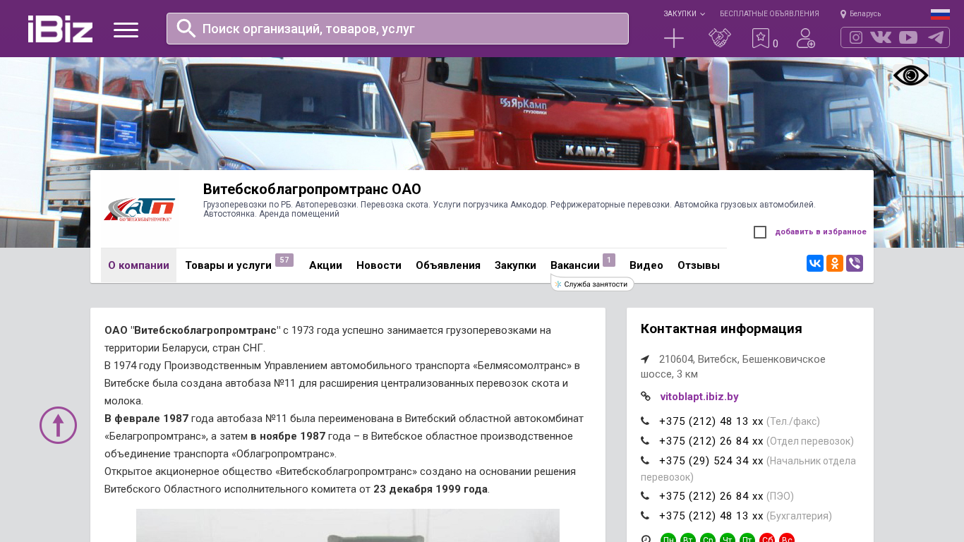 The website is a transportation company based in Belarus, specifically in the city of Vitsebsk. The company, named Vitoblapt OAO, offers various services related to cargo transportation within Belarus and neighboring countries. Some of the services provided include auto transport, livestock transport, specialized cargo handling with Amkodor services, refrigerated cargo transport, auto wash for cargo vehicles, an auto parking lot, and rental of facilities. The company's address and contact information are also available on the website.