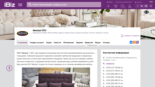 SEO-описание | Амплуа ООО - Производство мебели. Мягкая мебель. Диваны. Кровати. Кресла. Корпусная мебель. Гостиные. Прихожие. Спальни.. Схема проезда, контактные телефоны, адрес компании Амплуа ООО. 222166, , Будагово д., Полевая, 1 стр. 7 |