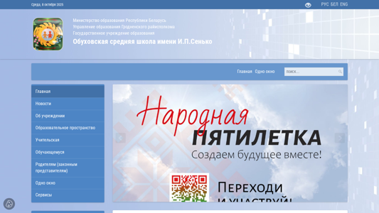 The portal Obuhovo.grodruo.by is a Belarusian educational website operated by the Obuhovskaya Middle School named after I.P. Sennik. The site is managed by the Ministry of Education of the Republic of Belarus and the Grodno Regional Executive Committee. It features electronic versions of textbooks from Molodezhstvie Belarus, a rating portal for evaluating the quality of services and administrative procedures of organizations in Belarus, and information about centralized testing and the 80th anniversary of the Victory in the Great Patriotic War. The school is also involved in various initiatives such as the Young Pedagogue School, the Day of the Teacher, and a traffic safety awareness campaign. Additionally, the site includes information about state guarantees and benefits for families with children, news from the union, and regional events.