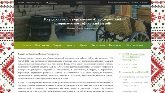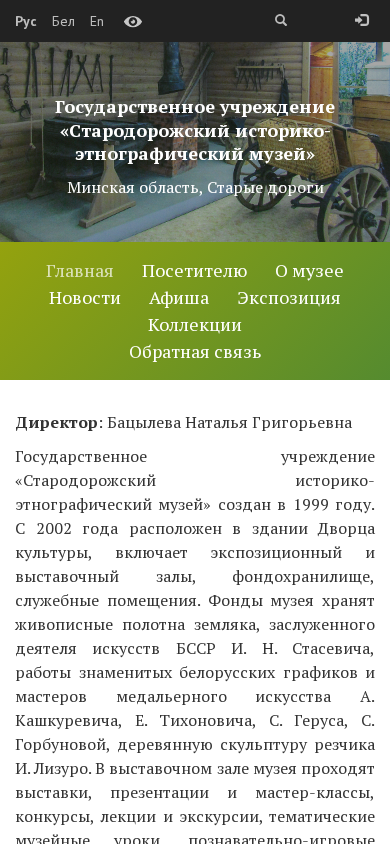| AI-анализ | The portal 'Starodor.museum.by' is the official website for the State Institution 'Staroдорожский историко-этнографический музей' (Old Road Historical and Ethnographic Museum). It provides news and event information, visitor information, pricing, exhibition details, collections, and resources for museum professionals. The museum was established in 1999 and is located in the Palace of Culture in the town of Starye Dorogi, Minskaya oblast, Belarus. The website includes sections for the museum's director, Natalia Batsileva, and information on admission for various museums. The museum houses a collection of paintings by local artist I.N. Stashevich, works by renowned Belarusian graphic artists and medal makers A. Kashkurevich, E. Tikhonovich, S. |