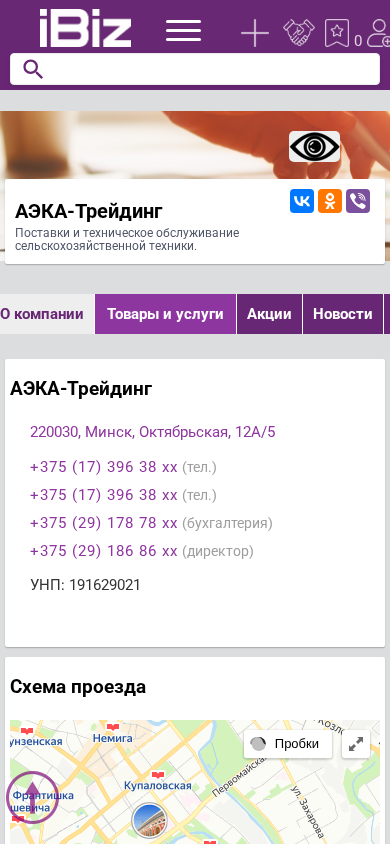 Название / Заголовок | АЭКА-Трейдинг - Поставки и техническое обслуживание сельскохозяйственной техники. . 220030, Минск, , Октябрьская, 12А/5 |