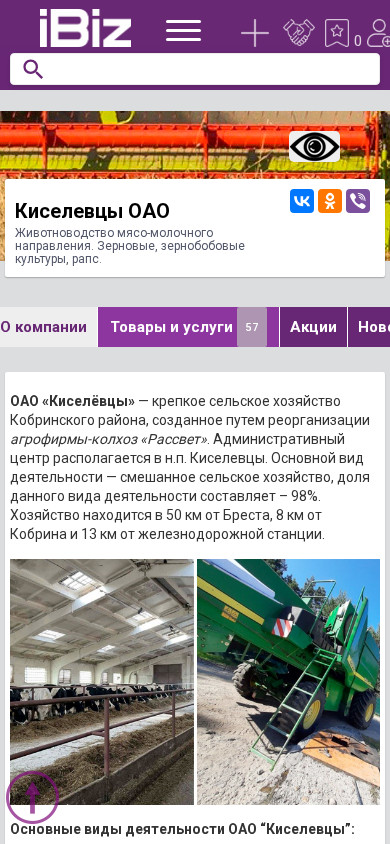 Название / ЗаголовокКиселевцы ОАО - Животноводство мясо-молочного направления. Зерновые, зернобобовые культуры, рапс.. 225867, , Киселевцы аг., Солнечная