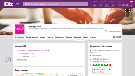 Название / Заголовок | Манжур ООО - Агентство переводов. Нотариальный перевод документов. Апостиль и легализация документов. Нотариальное заверение перевода. . 220005, Минск, , Независимости пр-т, 49, офис 420 |