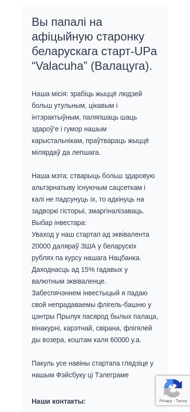 | AI-анализ | The website is for a Belarusian startup named Valacuha (Валацуга). Its mission is to make life more interesting, enjoyable and interactive for people, promote health and humor for its users, and revive the lives of the elderly, if possible, by integrating them. The investment requirement is an entry of $20,000 from the United States in Belarusian rubles at the National Bank exchange rate, with a 15% return in the equivalent currency. As a reward for investment, one can acquire an invaluable mansion in the center of Pryluk Palace, complete with saunas, a car park, a swimming pool, a garden, and a value of 60,000 U.S. dollars. All updates and news of the startup can be followed on Facebook and Telegram. Contact information includes a phone number, email address, and |
