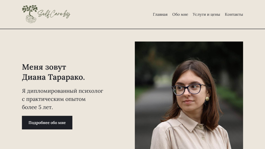 | AI-анализ | This website is a professional consultation service for adults seeking help with personal issues and crisis situations. Run by psychologist Diana Tararako, it offers both in-person consultations in Minsk and online sessions through Skype or Google Meet. The website includes information about the psychologist's background and approach, as well as details about consultation formats, pricing, and contact information. The domain name, SelfCare.by, reflects the focus on self-improvement and mental wellbeing. |