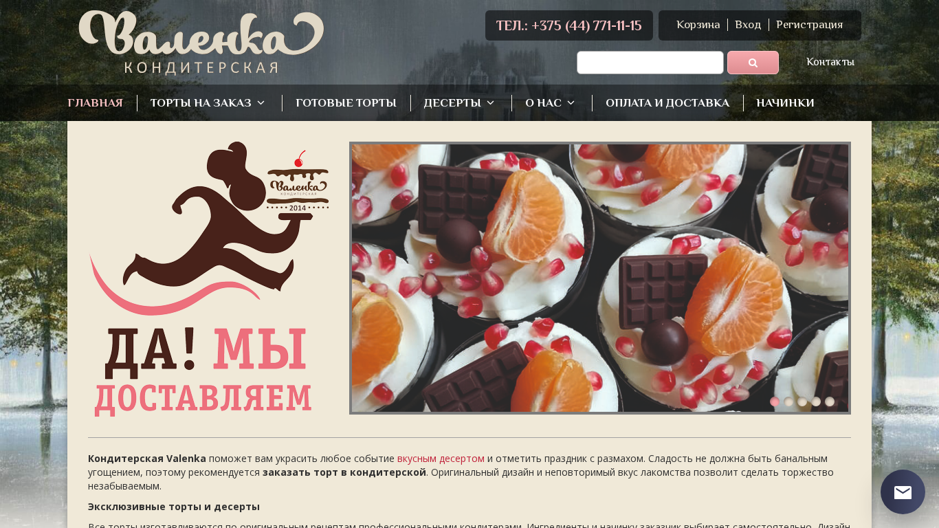 | SEO-описание | Заказать торт в Минске от кондитерской "Валенка" по доступным ценам. Доставка по городу. Большой ассортимент кондитерской продукции и тортов на заказ |
