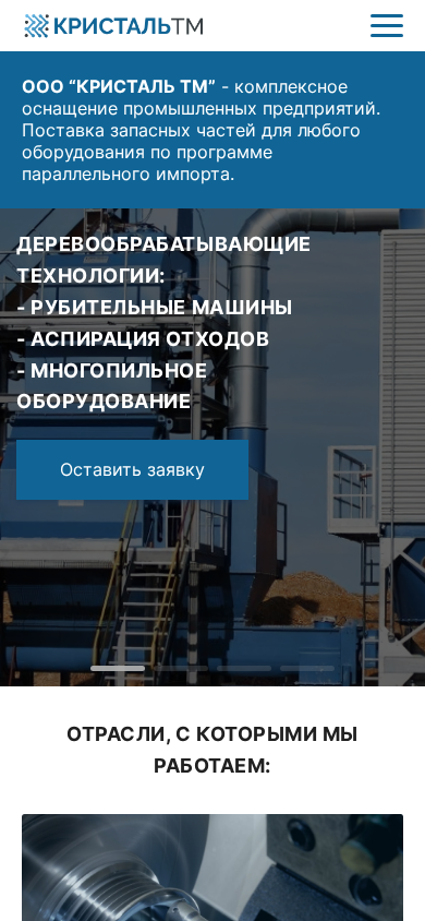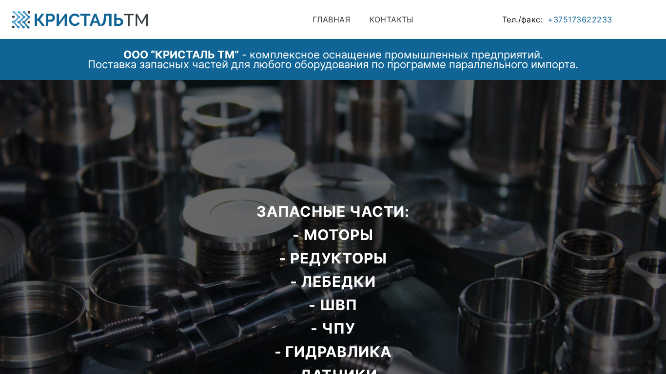 | AI-анализ | The website is a metalworking equipment supplier, offering CNC machines for metalworking and other industrial equipment. The company, OOO "Кристаль тм," also provides industrial tools and spare parts for various machinery. The main product categories include pneumatic, hydraulic, electric, specialized tools, and metalworking technologies such as cutting, forming, drilling, and milling. The website encourages visitors to place inquiries for quotations on various products and industrial sectors they serve, including metalworking, machinery manufacturing, energy, petrochemicals, and woodworking. The contact information includes a phone number and an email address. |