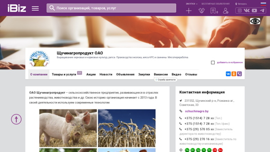 Название / Заголовок | Щучинагропродукт ОАО - Выращивание зерновых и кормовых культур, рапса. Производство молока, мяса КРС и свинины. Мясопереработка.. 231552, , Рожанка аг., Советская, 33 |